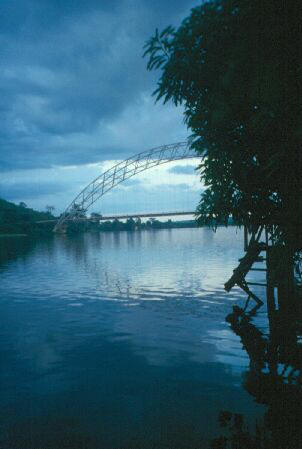 Nachmittags gibt es Gewitter und Dauerregen. Endlich, kurz vor Einsetzen der Dämmerung, hört es auf. Ich fahre noch kurz bis Akosombo. Auf dem Weg dorthin begegnen mir viele Jugendliche aus einem nahen College in verschiedenen Kleinbussen. Sie tragen überwiegend rote Kleidung und sind völlig aufgedreht. Sie wirken sehr bedrohlich und nur mit Schwierigkeiten kann ich sie überholen. In Akosombo-(City) gibt es eine Lodge, direkt am Volta-Fluß, die in Sichtweite zur Brücke liegt. Leider ist der Blickwinkel für ein Foto auf die Brücke nicht perfekt. Die Anlage ist überdies ausgebucht, so dass sie auch keine Alternative zum Volta-Hotel darstellt. Und es gibt keinen Strom.