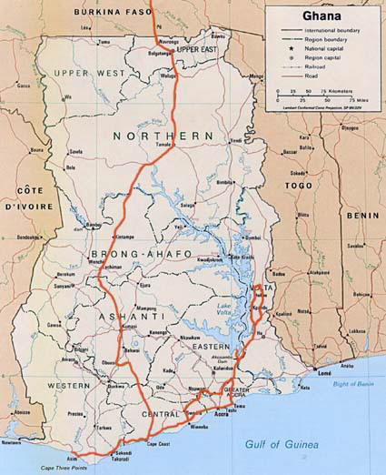 Ohne Beifahrer ist es schwer, sich zurechtzufinden. Ich habe drei verschiedene Karten von Ghana. Sie taugen alle nichts!! Die einzig brauchbare ist die von Michelin. Leider ist der Maßstab zu klein.